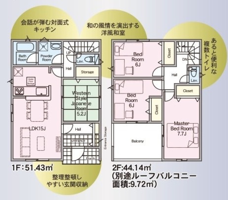 | 設備 | プロパンガス、上水道、トイレ2箇所、温水洗浄便座、シャンプードレッサー、浴室乾燥機、複層ガラス、ルーフバルコニー、床下収納、モニタ付インターホン、駐車3台以上可、バス・トイレ別、浴室1坪以上、追焚機能、浴室に窓、下水道 | ||