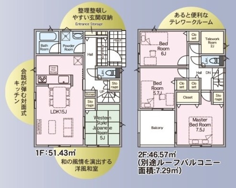 | 設備 | プロパンガス、上水道、トイレ2箇所、温水洗浄便座、シャンプードレッサー、浴室乾燥機、複層ガラス、ルーフバルコニー、床下収納、モニタ付インターホン、駐車3台以上可、バス・トイレ別、浴室1坪以上、追焚機能、浴室に窓 | ||